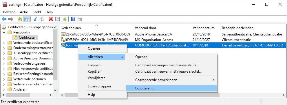 Dat ga je als volgt na. Druk op Windows-toets+R en voer het commando certmgr.msc uit. Open hier de rubriek Persoonlijk / Certificaten: het Comodo-certificaat verschijnt. Maak meteen van de gelegenheid gebruik dit certificaat met je privésleutel te back-uppen. Daarvoor klik je met rechts op het geselecteerde certificaat en kies je Alle taken / Exporteren. Druk op Volgende, selecteer Ja, de persoonlijke sleutel exporteren, druk op Volgende, laat de standaardinstellingen ongemoeid, klik nogmaals op Volgende, voorzie een wachtwoord (2x) en bewaar het bestand op een veilige, externe locatie. Gaat er naderhand iets fout, dan kun je dit langs dezelfde weg ook weer importeren.