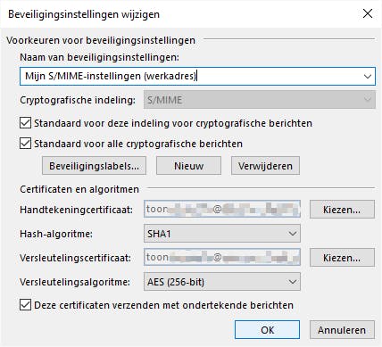 Bij Handtekeningcertificaat klik je op Kiezen en bevestig je dat je het Comodo-certificaat wilt gebruiken. Herhaal dit voor het Versleutelingscertificaat (mogelijk is dit al automatisch zo ingesteld). Vul een geschikte Naam van beveiligingsinstellingen in en rond af met OK (3x).