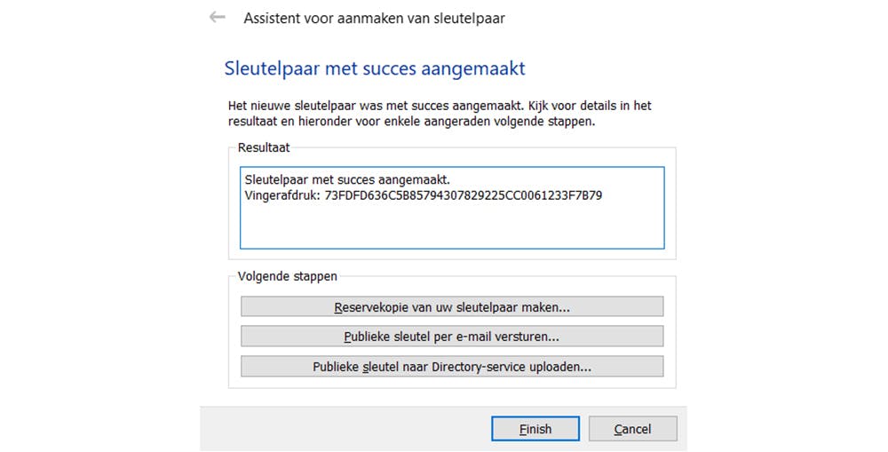 In de laatste stap kun je ook nog een reservekopie van je sleutelpaar maken. Je krijgt dan de vraag om je wachtwoordzin in te voeren. Klik tot slot op Finish om het aanmaken van het sleutelpaar af te sluiten.