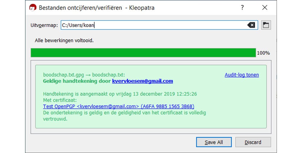 De ontvanger klikt dan in Kleopatra op Ontcijferen/verifiëren en kiest het versleutelde bestand. Als alles goed is, krijgt hij te zien dat de handtekening geldig is. Klikt hij op Save all, dan wordt het ontsleutelde bestand opgeslagen.