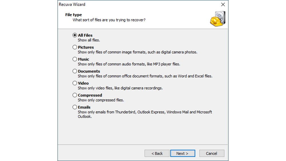 Klik op Next. De wizard vraagt welk soort bestanden je probeert te herstellen. Standaard is de optie All Files geselecteerd: Recuva toont dan alle gevonden bestanden.