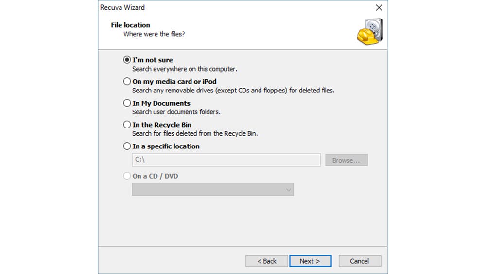 Voor een goed resultaat is het belangrijk om Recuva in de juiste richting te wijzen. In het volgende venster vraagt de wizard waar de verdwenen bestanden zich oorspronkelijk bevonden. Is de locatie onbekend? Kies dan voor I’m not sure. Hierbij wordt de volledige schijf doorzocht.