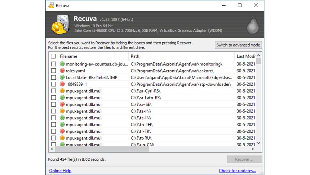Naast de relatief eenvoudige wizard, kent Recuva nog een geavanceerde modus. Klik in het scherm van de wizard op Switch to advanced mode. Links in het venster vind je een overzicht van alle gevonden bestanden. Gebruik het menu linksboven om te schakelen tussen de verschillende locaties, bijvoorbeeld tussen verschillende partities of vaste schijven.