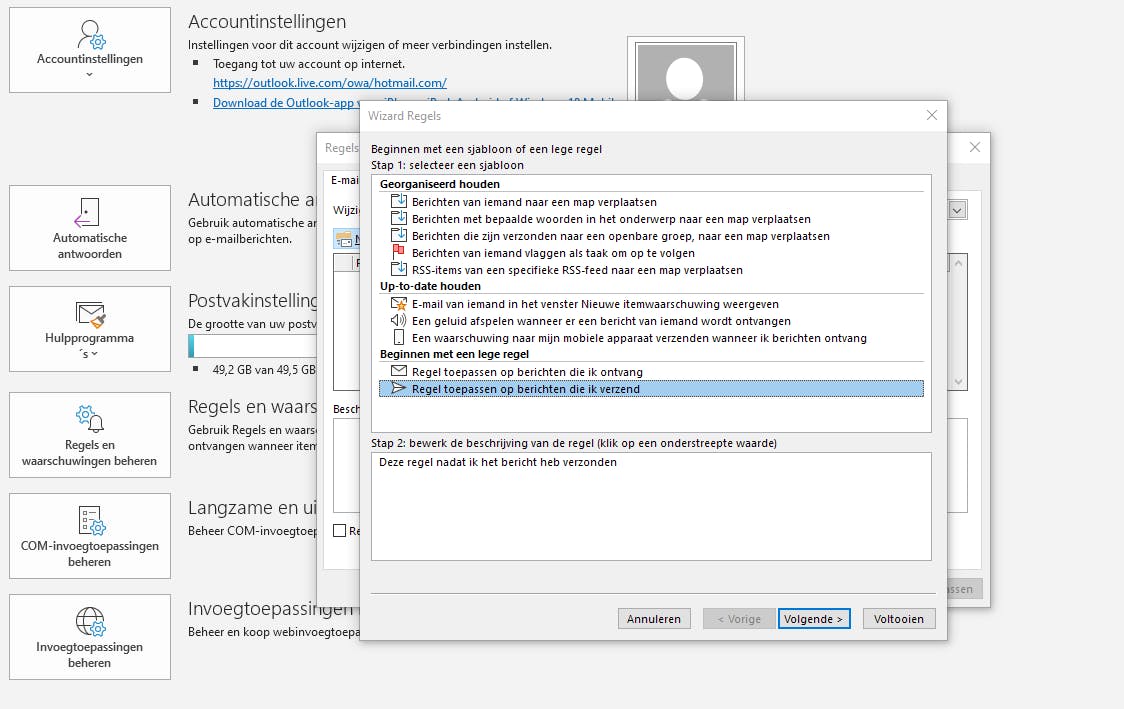 De vertraging bouw je in door middel van een regel. Hiervoor open je Microsoft Outlook en navigeer je via Bestand naar Info. Daar open je de groep Regels en waarschuwingen beheren. In het venster Regels en waarschuwingen klik je op de knop Nieuwe regel. Hierdoor opent Outlook de wizard die je helpt om een correcte regel samen te stellen. In de groep Beginnen met een lege regel selecteer je de optie Regel toepassen op berichten die ik verzend.