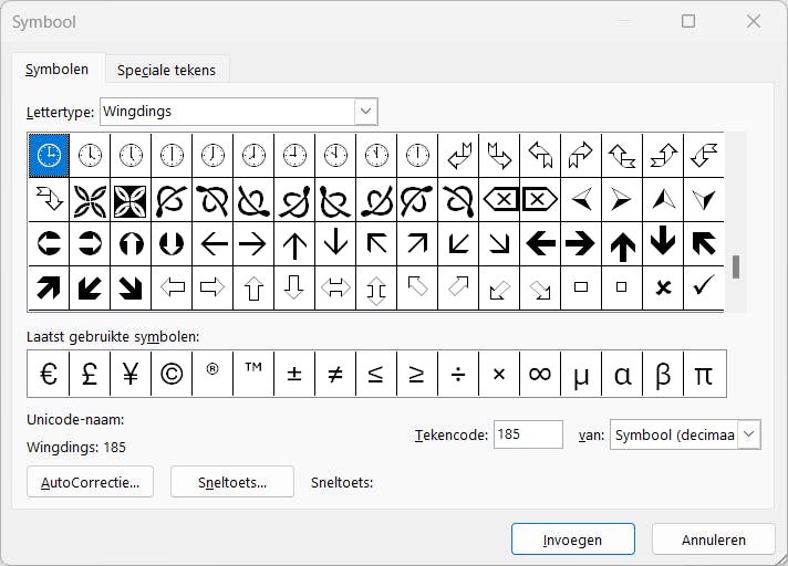 Daarnaast kun je ook een pijl toevoegen met de functie Symbool. Weer klik je op het tabblad Invoegen en dan zie bovenaan rechts de knop Symbool. In het uitklapmenu klik je op Meer en dan komt het keuzevenster tevoorschijn. Daar kun je een lettertype kiezen en bij Deelverzameling selecteer je Pijlen. De meeste lettertypes hebben hun eigen pijltekens. Als je bijvoorbeeld Wingdings als lettertype instelt en je scrolt een beetje naar beneden, dan vind je daar een set pijlen. Selecteer de pijl die je wilt gebruiken en klik op de knop Invoegen. Wanneer de pijl in de tekst staat, zal Word hem behandelen als een normaal tekstelement. Je kunt dus de lettergrootte wijzigen en de kleur, maar meer ook niet.