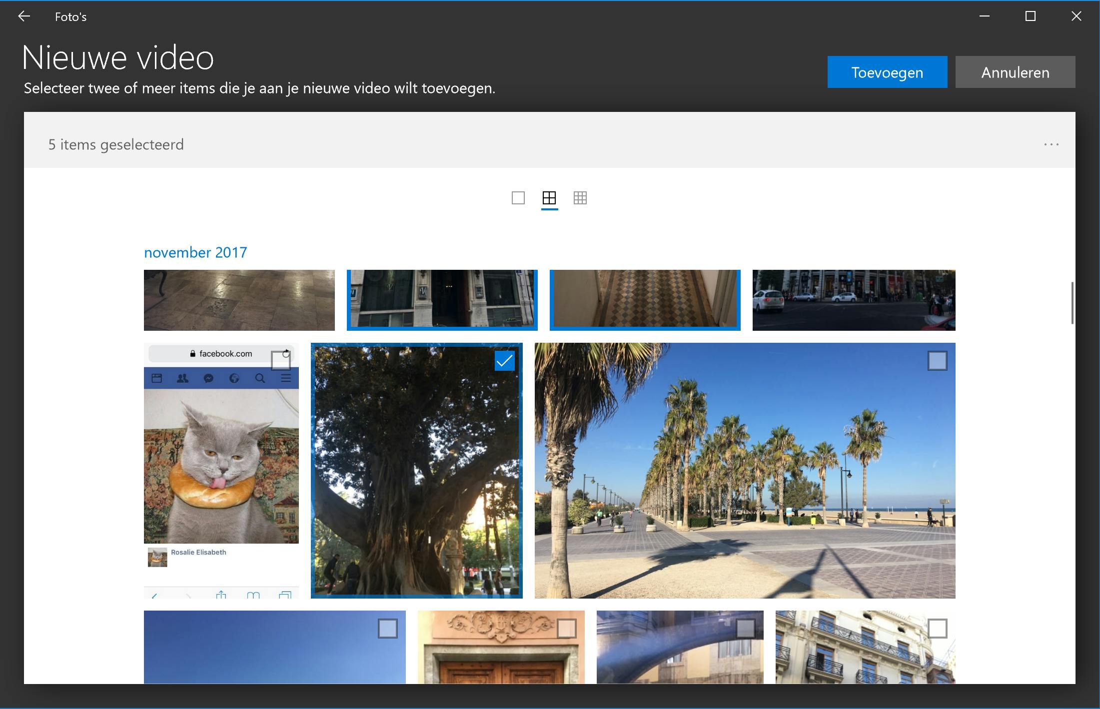 Kies de foto’s of video’s die je wilt gebruiken door op het vierkantje rechts bovenin te klikken. Als je klaar bent met selecteren, kies je voor Toevoegen. Je kunt overigens de weergave van je foto’s en video’s wijzigen door bovenin op een van de drie icoontjes te klikken. Story Remix maakt nu automatisch een video van je items zonder dat je daar iets voor hoeft te doen. Speel de video af door op de afspeelknop te drukken, mocht de app het niet al uit zichzelf afspelen.
