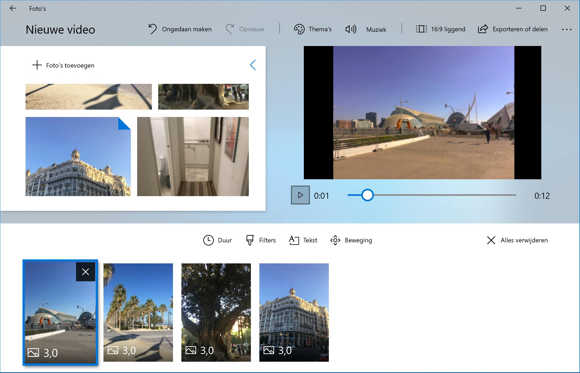 Onder in elke foto of video zie je hoelang het in de uiteindelijke video wordt getoond. Standaard is dat 3 seconden, maar je kunt er natuurlijk ook voor kiezen om een clip korter of langer weer te geven. Hiervoor selecteer je de desbetreffende foto of video en kies je voor Duur. Je hebt de keuze uit 1, 2, 3, 5 of 7 seconden, maar je kunt ook zelf een waarde ingeven. Er zit geen limiet aan de duur van een weergave. Als je een videobestand hebt toegevoegd, verandert de knop Duur in Knippen. Hier kun je het start- en eindpunt van je video bepalen.