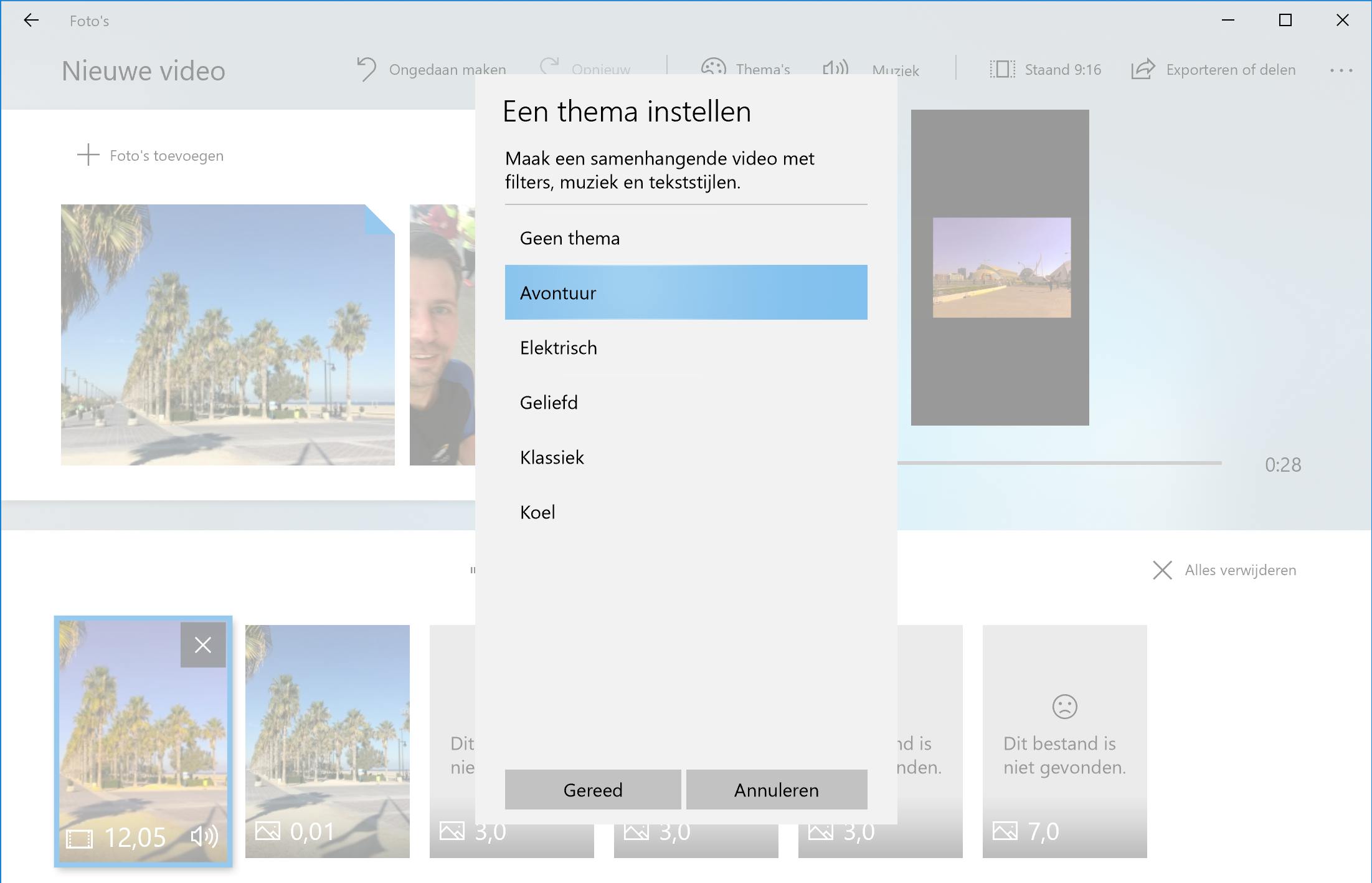 Je kunt het complete thema van je video wijzigen. Dat heeft effect op alle filters, tekststijlen en muziek. Het is dus handig om eerst een thema te kiezen voordat je individuele clips gaat bewerken. Klik op Thema’s en kies een van de opties daaronder. Wacht een paar seconden en speel je video af om te kijken hoe je remix er nu uitziet. Klaar? Dan is het tijd om je video helemaal naar je eigen wensen aan te passen. Elke wijziging start door een van de clips onderin te selecteren.