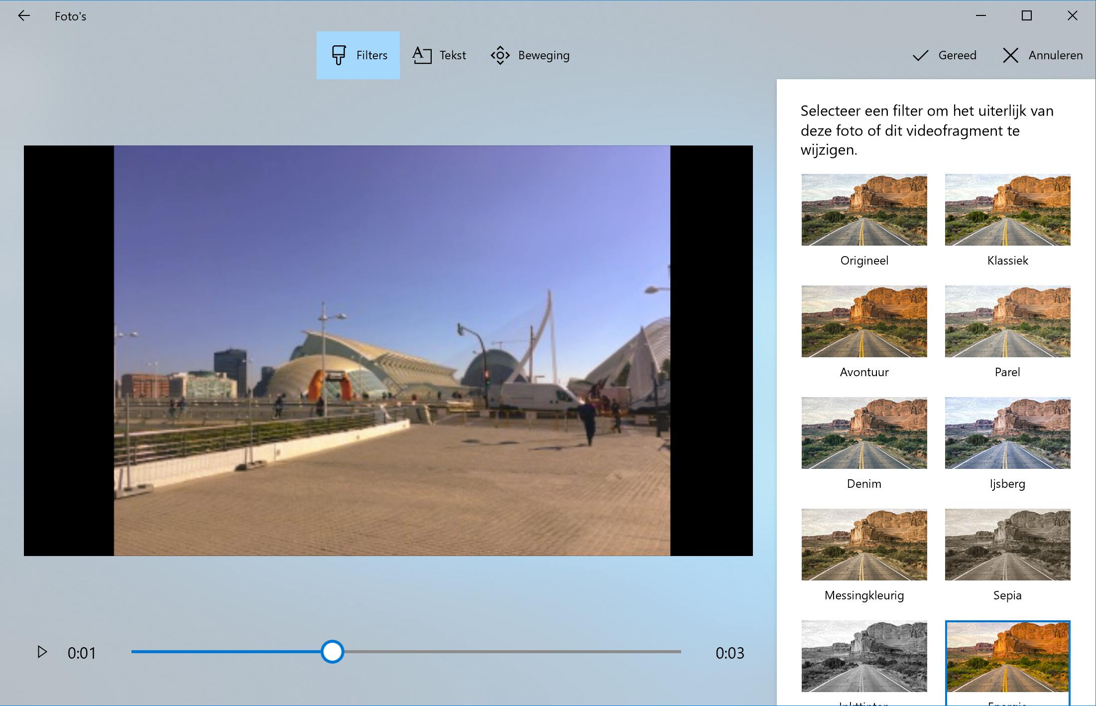 Story Remix voegt automatisch een filter aan je foto of video toe, maar uiteraard kun je dat aanpassen. Je vindt een heleboel Instagram-achtige filters terug als je op een clip klikt en voor Filters kiest. Kies een van de opties aan de rechterkant en je ziet meteen een voorbeeld van hoe je foto of video er met het gekozen filter uitziet. Ben je tevreden, klik dan bovenin op Gereed. Wees gerust: je kunt altijd weer terug naar een clip en het filter aanpassen.