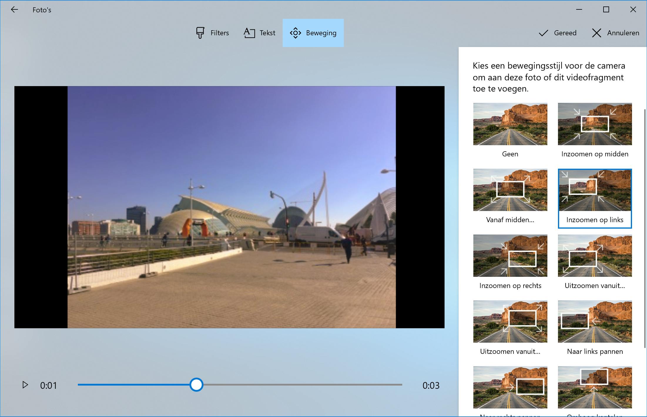 In je videovoorbeeld heb je al kunnen zien dat je foto’s niet statisch worden getoond, maar dat Story Remix er automatisch camerabewegingen aan toevoegde. Je kunt per clip een andere camerabeweging kiezen. Hiervoor klik je op Beweging. Rechts zie nu de beschikbare opties. Bij de optie Naar links pannen zie je bijvoorbeeld dat de camera langzaam van rechts naar links beweegt. Een optie als Inzoomen op midden betekent dat de camera langzaam inzoomt op het middelste punt van je foto.