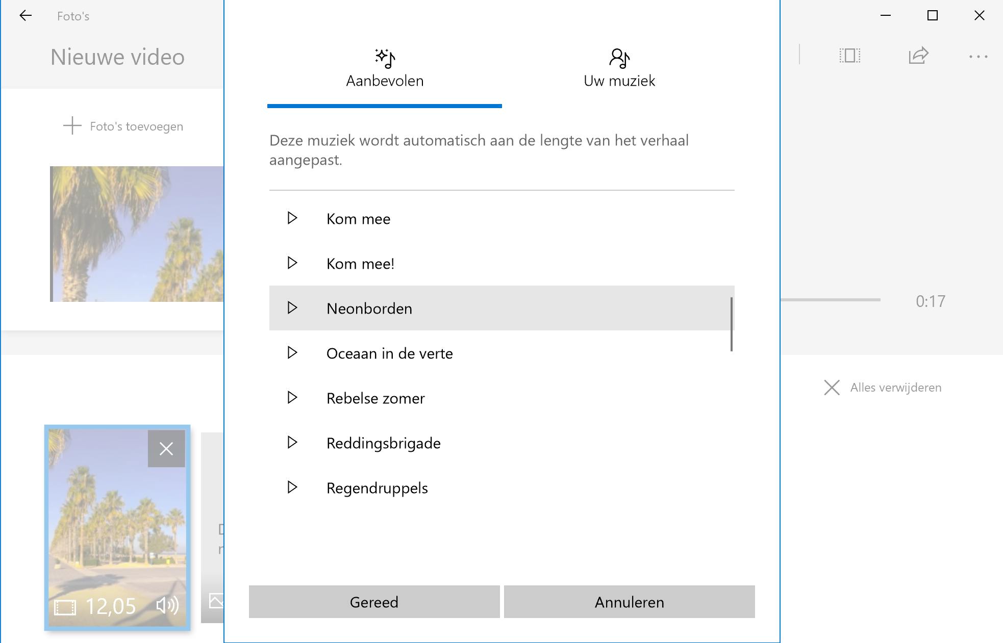 Op het eind kun je nog bepalen of je muziek aan je video wilt toevoegen of dat je de automatisch toegevoegde muziek wilt aanpassen. Klik bovenin op Muziek en kies een van de standaard muziekbestanden door onder Aanbevolen op een muziekje te klikken. Druk op de afspeelknop om het muziekbestand af te spelen. Je kunt ook een liedje uit je eigen bibliotheek toevoegen door op Uw muziek te klikken. Kies voor Gereed om de muziek aan de video toe te voegen.