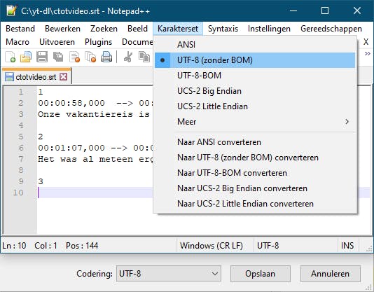 Bewaar het ondertitelingsbestand met extensie .srt en kies als codering UTF-8 (zonder BOM). Zoals gezegd geef je het bestand het liefst dezelfde naam en locatie mee als het eigenlijke videobestand.