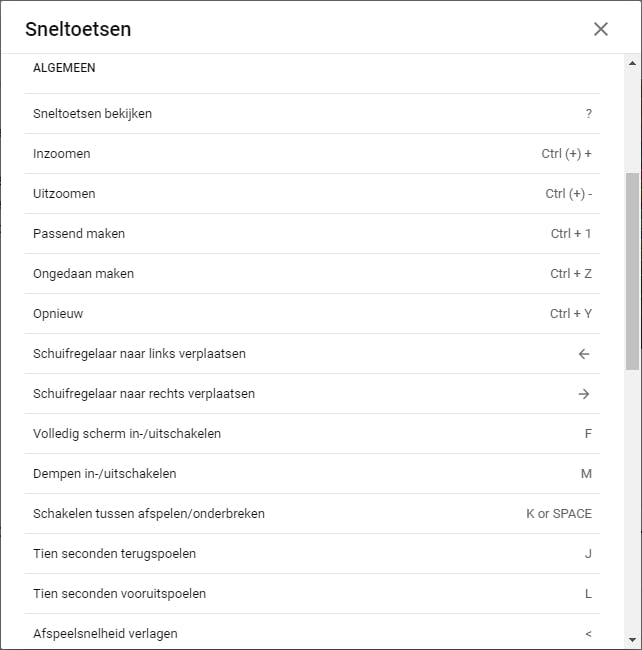 Ook de timings kun je in de bijhorende vakjes invullen (volgens de syntax minuten:seconden:frames). De timings aanpassen kan ook vanuit de tijdlijn. Je kunt hier het blauwe blokje van de geselecteerde ondertitel verslepen of je verplaatst de uiteinden, zodat het blokje en dus de tijdsduur korter of langer worden. Met de schuifbalk zoom je in of uit op de tijdlijn. Een nieuwe ondertitel toevoegen doe je met + Ondertiteling en via het vuilnisbakicoon verwijder je een ongewenste ondertitel. Klik op sneltoetsen onder de videoweergaven voor een overzicht van dertig sneltoetsen – handig om af te drukken als spiekblad.