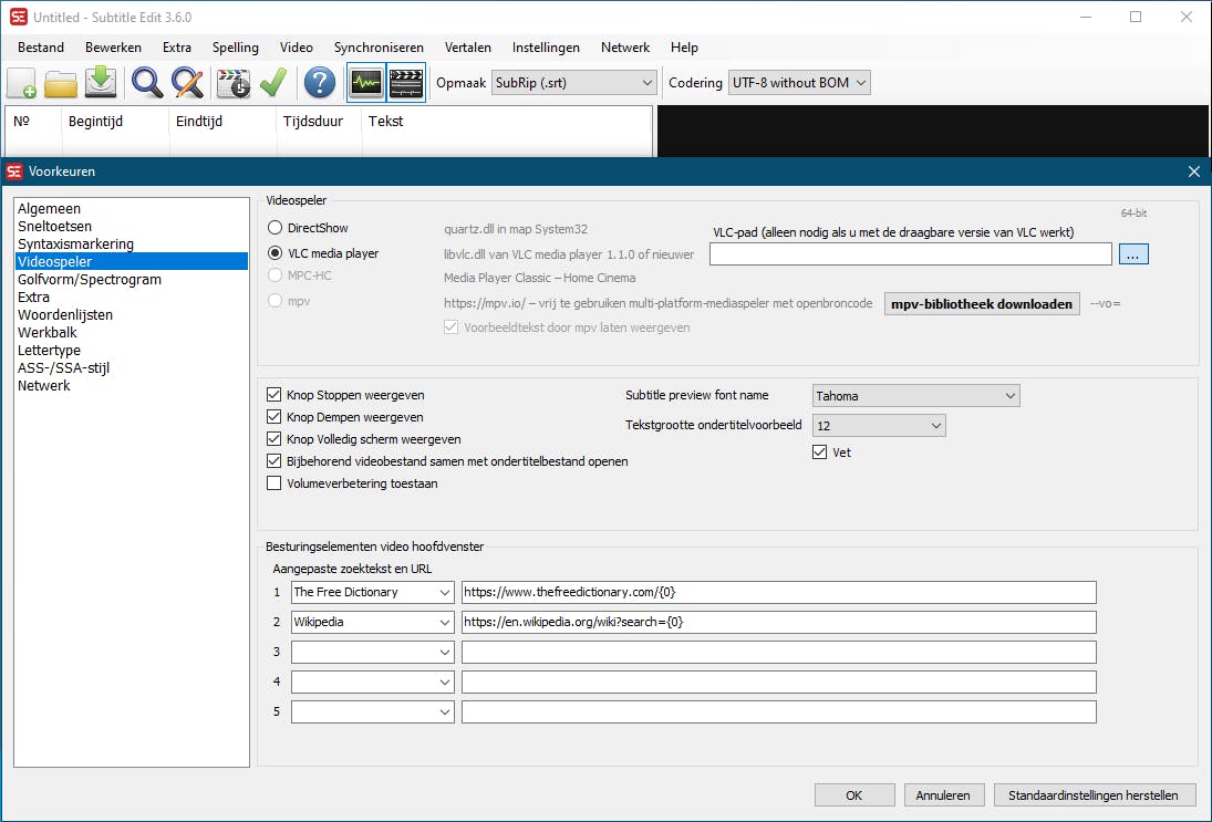In principe hoef je nu maar je videobestand op te halen via Video / Videobestand openen. Weigert Subtitle Edit de video te openen, kies dan Instellingen / Voorkeuren. Open Videospeler en selecteer VLC Media Player (die je inmiddels geïnstalleerd hebt). Gebruik de 64bit-versie voor Windows 64 bit. Beschik je over een portable VLC-versie, verwijs dan via het knopje met de drie puntjes naar het exe-bestand van VLC.