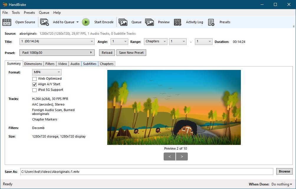 Je kunt ook nog allerlei andere waarden optimaliseren op de tabbladen Dimensions, Filters, Video, Audio en Chapters. Klik op Browse (helemaal rechtsonder) voor een geschikte opslaglocatie van de aangepaste video en bevestig met Start Encode.