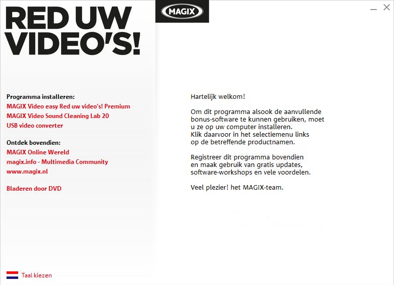 Installeer nu het programma Red uw Video’s op je computer. Doe de dvd in de pc en start de schijf op. Heb je geen dvd-station in je pc, dan kun je de software via de MAGIX-site downloaden. Vanuit het introductievenster zijn er verschillende programma’s beschikbaar. Kies voor MAGIX Video easy Red uw video’s. Dit programma helpt je om de inhoud van videotapes op de computer te bewaren. Klik telkens op Volgende om de installatiewizard door te nemen en ga akkoord met de licentievoorwaarden. Je kiest voor een standaardinstallatie. Vergeet niet om het vinkje voor Simpliclean installeren weg te halen, want dit programmaonderdeel is volkomen nutteloos. Bevestig met Installeren en klik na even wachten op Voltooien.