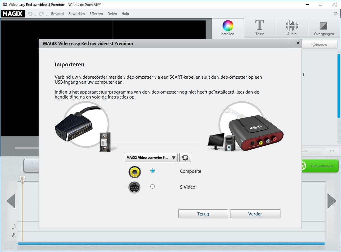 Zodra de boel correct is aangesloten, ga je met de software van MAGIX aan de slag. Open het programma Video easy Red uw video’s en kies in het introductievenster voor Nieuw videoproject aanmaken. Je bedenkt een logische projectnaam, waarna je bevestigt met OK. Kies in het volgende scherm voor Video’s van analoge bronnen (bv. Videorecorder) importeren. MAGIX wil de analoge video graag digitaliseren middels de mpeg2-codec. Klik hiervoor op MPEG2-encoder activeren en Online om de activering in orde te maken. Je vult hiervoor opnieuw het serienummer en het e-mailadres in. De software wil graag weten op welke wijze je de usb-omvormer hebt aangesloten. Bij gebruik van de scart- of composietaansluiting selecteer je de optie Composite. Bij S-Video kies je voor die gelijknamige optie. Klik ten slotte op Verder.