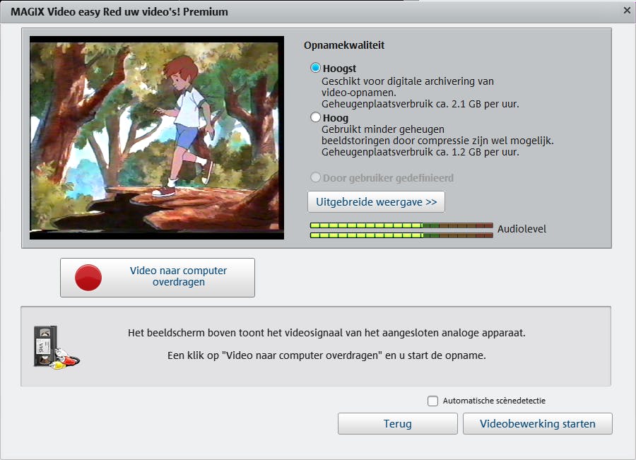 Je controleert eerst of de software de usb-omvormer herkent. Druk hiervoor op de playknop van de videorecorder en wacht af of er beeld in het voorbeeldvenster verschijnt. Bekijk meteen of de beeldweergave naar wens is. Druk op de stopknop van de videorecorder en spoel de videotape weer terug naar het beoogde beginpunt. Je stelt vervolgens de gewenste videokwaliteit in. Voor de beste overdracht selecteer je de optie Hoogst. Bedenk wel dat de uiteindelijke videobestanden dan meer opslagcapaciteit in beslag nemen. Houd ongeveer rekening met 2,1 GB dataopslag per uur video. Vind je dat te gortig? Met de optie Hoog sla je de video’s op in een hogere compressie en dien je ongeveer 1,2 GB per uur te reserveren. De keerzijde van deze optie is dat er een grotere kans is op haperingen. Vink onderaan de optie Automatische scènedetectie aan indien je de video wilt splitsen in meerdere hoofdstukken. Dat is bijvoorbeeld handig wanneer je van de film een dvd inclusief menu wilt maken. Gebruik je graag specifieke video-instellingen? Gevorderden zetten via de knop Uitgebreide weergave meer instellingen naar hun hand.