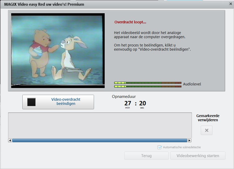 Je start op je pc de opname door op Video naar computer overdragen te klikken. Er is hier wel wat geduld voor nodig, want de opname duurt net zo lang als de speellengte van de videoband. Wil je de opname op je pc graag stoppen? Klik op de knop Video-overdracht beëindigen. De vastgelegde videoclip verschijnt onderaan in het venster. Het is mogelijk om meerdere clips van een videoband te maken. Dat is bijvoorbeeld nuttig wanneer je alleen bepaalde fragmenten van een videotape wilt digitaliseren. In dat geval klik je wederom op Video naar computer overdragen.