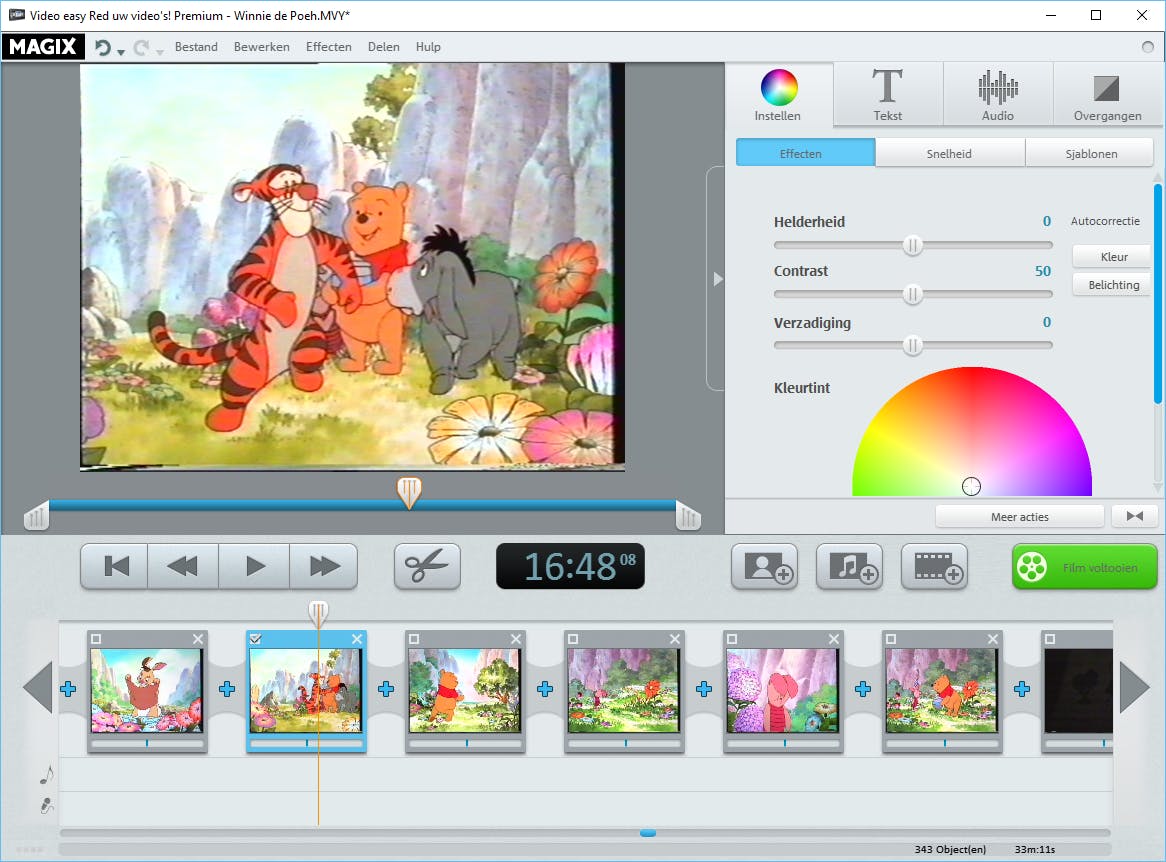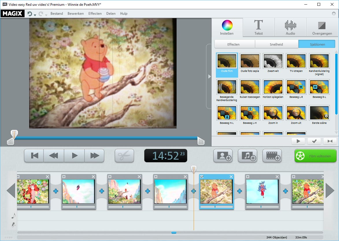 De software van MAGIX heeft allerlei slimme bewerkingsopties in huis waarmee je de beelden verfraait. Ga maar eens naar Instellen / Effecten. Met de schuifregelaars pas je de helderheid, het contrast en de verzadiging aan. Iedere wijziging is direct in het voorbeeldvenster zichtbaar. Verder zijn de opties onder Sjablonen een aanrader. Je stelt hier allerlei leuke effecten in. Je creëert bijvoorbeeld een retrosfeer door voor Oude foto sepia of Oude film te kiezen. Dubbelklik op een effect om deze direct toe te passen. Via het onderdeel Tekst voeg je desgewenst titels aan de video toe. Onder Sjablonen maak je kinderlijk eenvoudig een professionele aftiteling of ondertiteling aan. Ten slotte laat je videoclips soepel in elkaar overvloeien door het gebruik van overgangen. Ga hiervoor naar Overgangen en sleep ze één-voor-één naar de tijdlijn.
