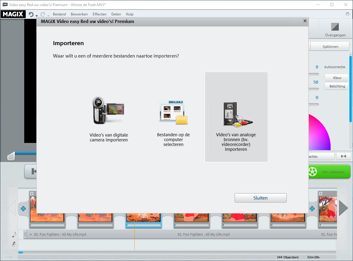 Het staat je vrij om foto’s, muziek en video’s aan het huidige project toe te voegen. Je gebruikt hiervoor de drie knoppen met het plusteken in het rechterdeelvenster. Klik op het pictogram met het poppetje om een foto op je harde schijf te selecteren. De software voegt de afbeelding aan het einde van de tijdlijn toe, waarna je zelf de beoogde plek kiest. Het toevoegen van muziek werkt min of meer op dezelfde manier, met het verschil dat het nummer als soundtrack van de video actief is. Handig voor het geval je de video wilt voorzien van een achtergronddeuntje. Zodra je het liedje hebt geselecteerd, verschijnt het muziekbestand onder alle videoclips in de tijdlijn. Ten slotte voeg je desgewenst een nieuwe video toe door bijvoorbeeld een VHS-band te digitaliseren. Zie hiervoor de instructies vanaf tip 5 uit dit artikel.