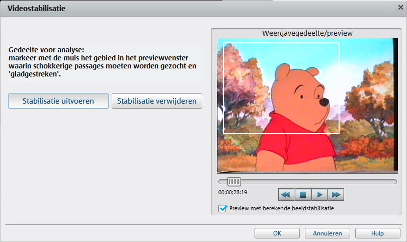 Mogelijk zijn de gedigitaliseerde beelden wat schokkerig. Gelukkig kun je daar eenvoudig iets aan doen. Selecteer in de tijdlijn de videoclip en ga in het menu naar Effecten / Videostabilisatie. Het is de bedoeling dat je in de voorbeeldweergave het gebied aanwijst waarin deze schokken hoofdzakelijk opduiken. Trek hiervoor met ingedrukte muisknop een vierkant. Is de hele video schokkerig, dan markeer je het volledige voorbeeldvenster. Je bevestigt met Stabilisatie uitvoeren, waarna de software het geselecteerde gebied probeert ‘glad te strijken’. Houd er rekening mee dat deze taak veel processorcapaciteit vergt en mogelijk enige tijd duurt.