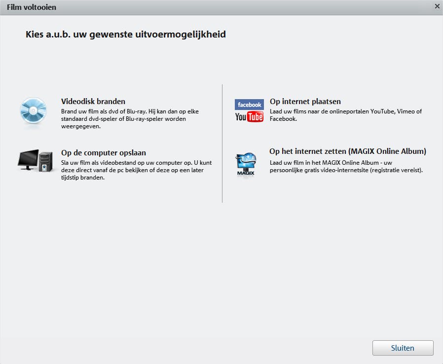 Zodra je tevreden bent met het resultaat, sla je de video op. Klik hiervoor op de groene knop Film voltooien. Er verschijnt een keuzemenu in beeld. Kies voor Op de computer opslaan. Je bewaart de video dan in het wmv-formaat. Verder stel je de kwaliteit in. Aangezien de oorspronkelijke opnamen analoog zijn, heeft het geen zin om een hogere resolutie te selecteren. Kies om die reden voor Webkwaliteit of Dvd-kwaliteit en bevestig met Video opslaan. Selecteer de opslaglocatie en klik als laatste op Opslaan. Houd er rekening mee dat deze taak doorgaans veel tijd in beslag neemt. Je hoeft je video niet lokaal te bewaren op je harde schijf, het keuzemenu biedt ook andere opties. Zo brand je het videoproject als alternatief op een dvd of blu-ray-schijf. Ook kun je de video eventueel rechtstreeks uploaden naar YouTube, Vimeo of Facebook.