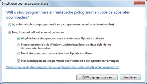 Het is ook mogelijk Windows automatisch naar drivers te laten zoeken zodra je een nieuw apparaat aan je systeem hebt gekoppeld. Deze optie activeer je vanuit het Configuratiescherm waar je (in pictogramweergave) Apparaten en printers selecteert. Vervolgens klik je de naam van je computer met de rechtermuisknop aan en kies je Instellingen voor installatie van apparaat. Stip de optie Ja, automatisch stuurprogramma's en pictogrammen downloaden (aanbevolen) aan als je inderdaad zo'n automatische installatie verkiest. Het alternatief is Nee, ik bepaal zelf wat er moet gebeuren, waarna je bijvoorbeeld Stuurprogramma's via Windows Update installeren als deze zich niet op de computer bevinden kunt aanstippen. Bevestig je keuze met Wijzigingen opslaan.