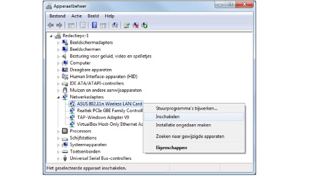 Als alle drivers goed zijn geïnstalleerd en dus je apparaten verondersteld worden correct te functioneren, dan krijg je een lijst met de verschillende apparaattypes opgesomd. Klik een wit driehoekje naast zo'n apparaattype aan om de afzonderlijke apparaten te zien. Zie je rood kruisje (Windows XP) of een klein zwart pijltje in het apparaatpictogram, dan betekent dit dat dit apparaat om een of andere reden is uitgeschakeld. Heb je het apparaat nodig, klik het dan met de rechtermuisknop aan en kies Inschakelen. Zo gemakkelijk kan het zijn.