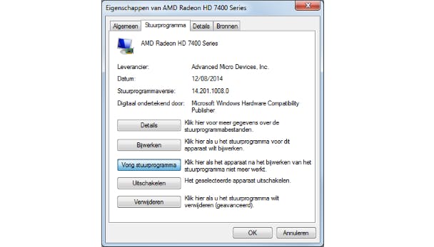 Het kan altijd gebeuren dat een driverupdate niet het gehoopte resultaat geeft. Daarom is het belangrijk dat je vóór de installatie altijd eerst een systeemherstelpunt maakt, zodat je naar dat punt kunt terugkeren. Een alternatief (althans tot en met Windows 7) is dat je bij het opstarten van het systeem even de F8-toets ingedrukt houdt en in het geavanceerde opstartmenu van Windows de optie Laatst bekende juiste configuratie selecteert. Wat je ook nog kunt proberen, is Windows opstarten in veilige modus, waarna je het Apparaatbeheer opent, het gebrekkige apparaat met rechtermuisknop aanklikt en Eigenschappen selecteert. Mogelijk vind je dan op het tabblad Stuurprogramma de optie Vorig stuurprogramma terug. Die zorgt ervoor dat Windows naar de vorige driver zal terugkeren.