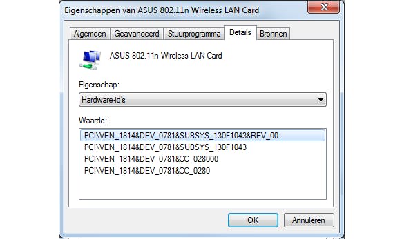 Selecteer de eigenschap hardware-id's om je zoektocht naar een geschikte driver op internet te starten.
