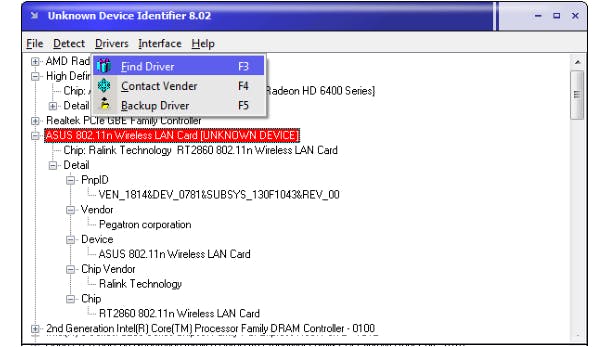 Overigens bestaat er ook een gratis tool die het zoeken naar de hardware-ID's wat makkelijker maakt: Unknown Device Identifier. Die geeft je niet alleen de hardware-ID's mee, maar vertelt je meteen ook wie de producent is en mogelijk ook om welk apparaat het gaat. Via het menu Drivers / Find Driver speelt het programma een geschikte zoekactie dan meteen door aan Google.