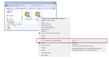Klik met rechts op een iso-bestand en kies 'Mount' om het bestand te koppelen aan de virtuele dvd-speler.