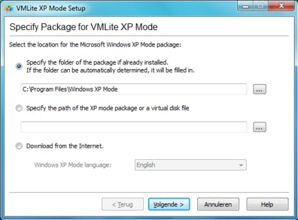Voor computers die niet aan bovenstaande eisen voldoen is er daarom VMLite XP Mode. Het programma is gebaseerd op het opensource-virtualisatiepakket VirtualBox en werkt op alle versies van Windows 7 en op alle processors. U kunt natuurlijk ook uw virtuele Windows XP in VirtualBox draaien, maar VMLite XP Mode voegt er toch een aantal handigheidjes aan toe. Zo is er een installatiewizard die u toelaat om een al geïnstalleerde of gedownloade XP-modus van Microsoft te hergebruiken in VMLite XP Mode. Het programma haalt de Windows-versie hier dan uit en configureert die. U kunt bovendien rechtstreeks vanuit de installatiewizard een XP Mode downloaden van de website van Microsoft. De licentie van Microsofts XP Mode is overigens enkel geldig voor gebruikers van Windows 7 Professional, Ultimate of Enterprise. Hebt u zelf nog een ongebruikte XP-licentie, dan is er niets aan de hand.