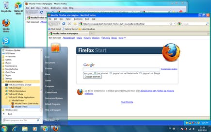 De handigste functie heeft VMLite XP Mode afgekeken van Microsofts XP Mode: als u een programma in een virtuele XP-machine geïnstalleerd hebt, verschijnt het automatisch ook in het startmenu van Windows 7, onder het submenu VMLite Workstation - VMLite XP Mode Applications. Zo kunt u rechtstreeks vanuit het startmenu een toepassing in een virtuele XP-machine opstarten. De vensters van deze programma’s worden omlijst met een groene rand, evenals snelkoppelingen die u op het bureaublad plaatst.