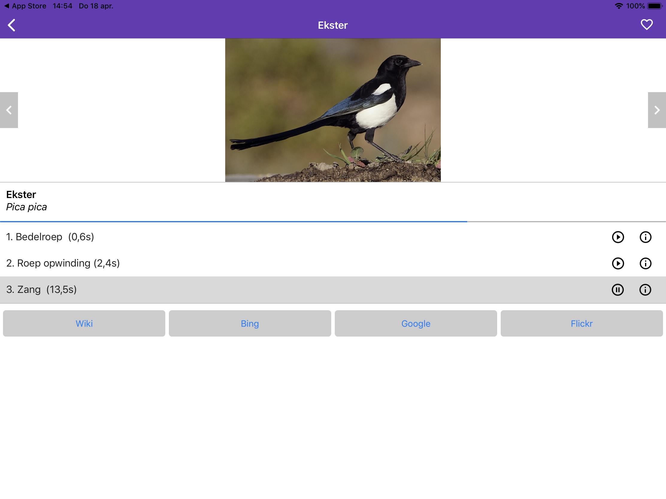 Onlangs bespraken we op deze plek de app Vogels van Europa. Hoewel fraai en informatief was die wat beperkt in zijn aanbod aan geluid; namelijk één fragment per soort. Wie een hond of kat heeft, weet echter dat die beesten niet alleen ‘waf’ of ‘miauw’ zeggen maar een heel scala aan klanken tot hun beschikking hebben om hun gemoedstoestand te delen. Bij vogels is het al niet anders, en daarom is de app Vogelzang zo handig. Deze geeft van 200 soorten meerdere geluiden, zoals het alarmsignaal. Voor aanvullende informatie vindt u per soort linkjes naar onder andere Wikipedia.