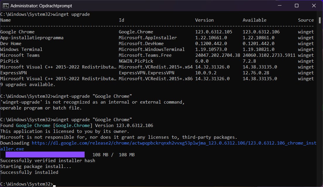 In plaats van AppName typ je de naam van de app zoals die in de lijst wordt genoemd en deze naam moet tussen rechte aanhalingstekens staan. Hierdoor begint de opdracht met het bijwerken van de opgegeven app en zie je live de voortgang in het CMD-venster.