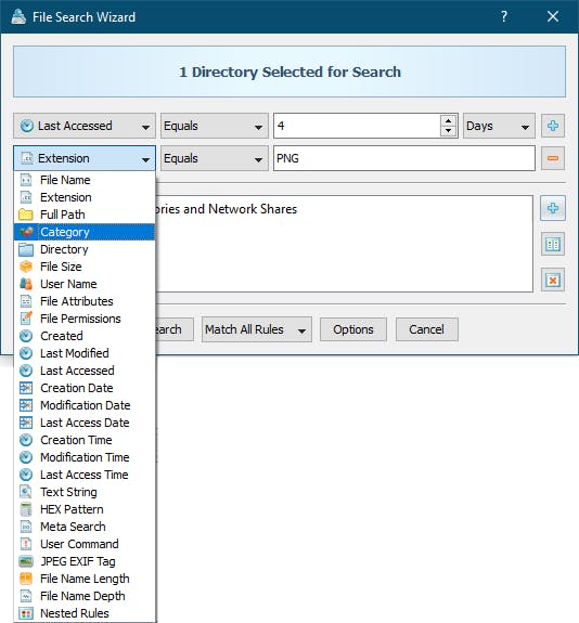 Met een druk op de knop start je een zoekwizard waarbij je de zoekcriteria via uitklapmenu’s instelt. Je kunt uit zo’n bijna dertig standaardcriteria kiezen, waaronder Last Accessed, File Permissions, Meta Search, Text String en HEX Pattern. Afhankelijk van je keuze geef je dan meer specifieke informatie door. Bij Last Accessed bijvoorbeeld stel je dan een aantal dagen in of je kiest Today, This week enzovoort. Uiteraard dien je ook nog aan te geven waar je precies wilt zoeken en dat kan op meerdere locaties tegelijk zijn, zowel mappen, schijven als netwerkshares.