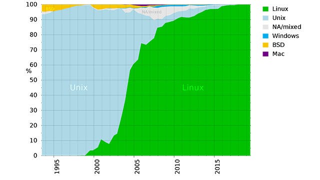 Eén domein waarin Linux totaal domineert, is het domein van de supercomputers: sinds 2017 draaien de 500 krachtigste supercomputers ter wereld allemaal Linux, en ook in de jaren ervoor was het overwicht enorm. Gedurende 25 jaar is de dominantie verschoven van Unix naar Linux; Windows heeft nooit een noemenswaardige rol gespeeld in supercomputing en maximaal een aandeel van 1 procent gehaald in de top 500.