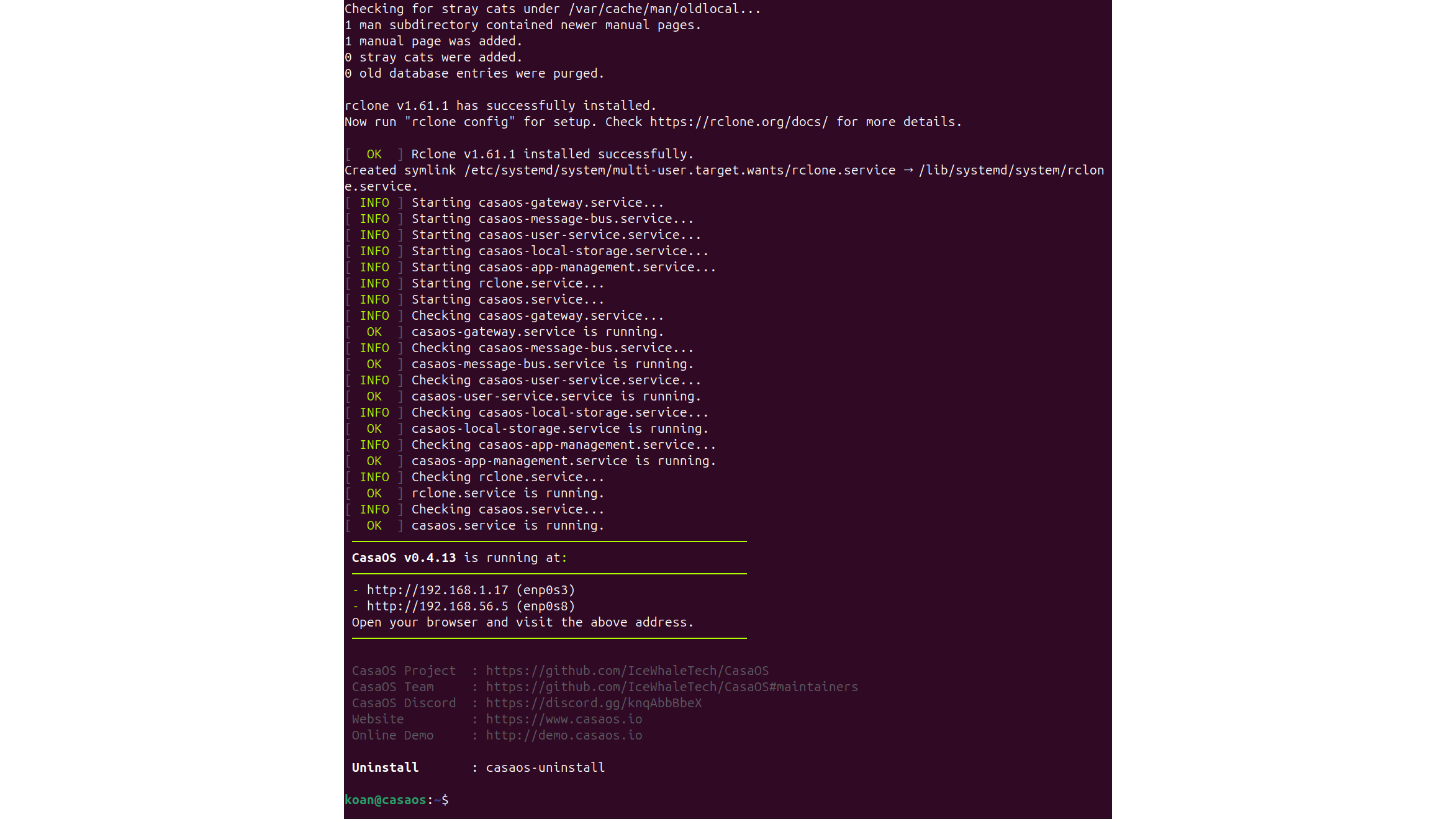 Het installatiescript controleert allerlei systeemvereisten en installeert ook pakketten die nodig zijn voor CasaOS. Dat kan enige tijd duren. Als alles naar behoren verloopt, krijg je op het einde in je terminalvenster het ip-adres te zien waarop de webinterface van CasaOS bereikbaar is.