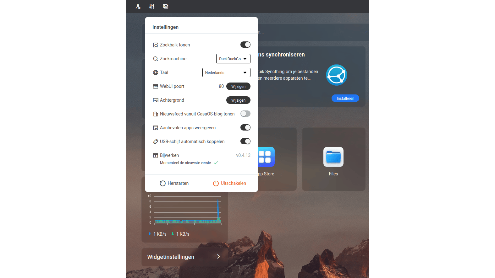 Als je op het instellingenicoontje klikt, kun je een reeks algemene instellingen aanpassen. Zo kies je hier of je de zoekbalk wilt zien en welke zoekmachine je daarin gebruikt, en configureer je de taal van CasaOS (Nederlands behoort tot de opties). Ook de achtergrondafbeelding is te wijzigen naar een van de andere meegeleverde afbeeldingen of een bestand dat je zelf uploadt.