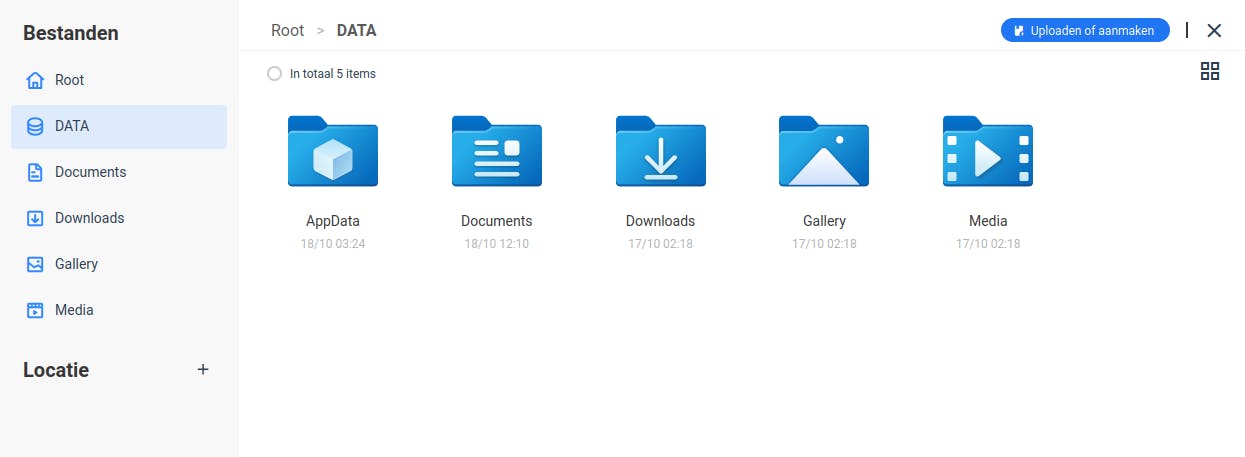 In elke map kun je bovenaan op Uploaden of aanmaken klikken om een bestand of map te uploaden, of een nieuw bestand of nieuwe map aan te maken. In een lege map krijg je deze mogelijkheden ook wat zichtbaarder te zien als icoontjes in het midden van de mapweergave.