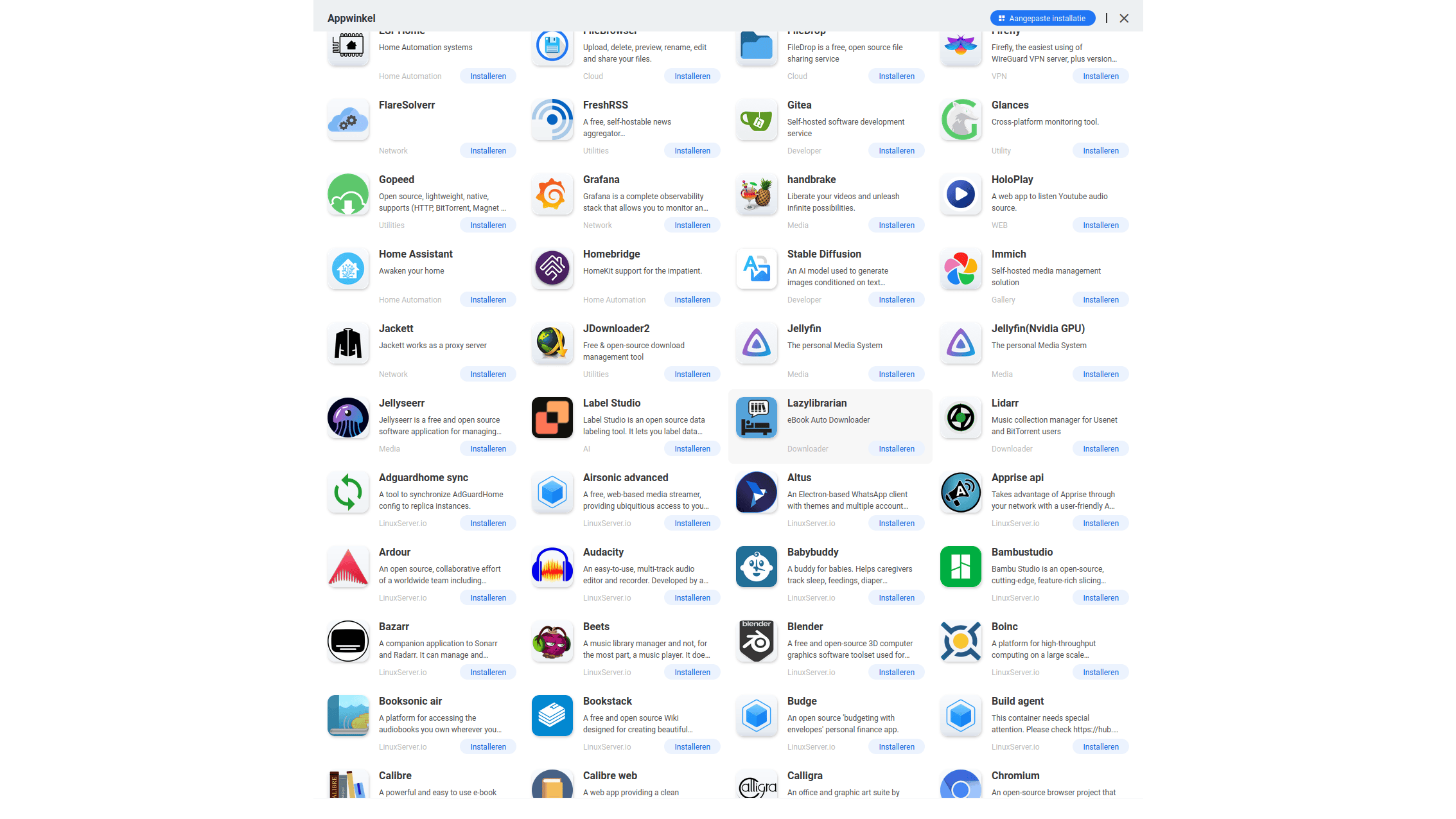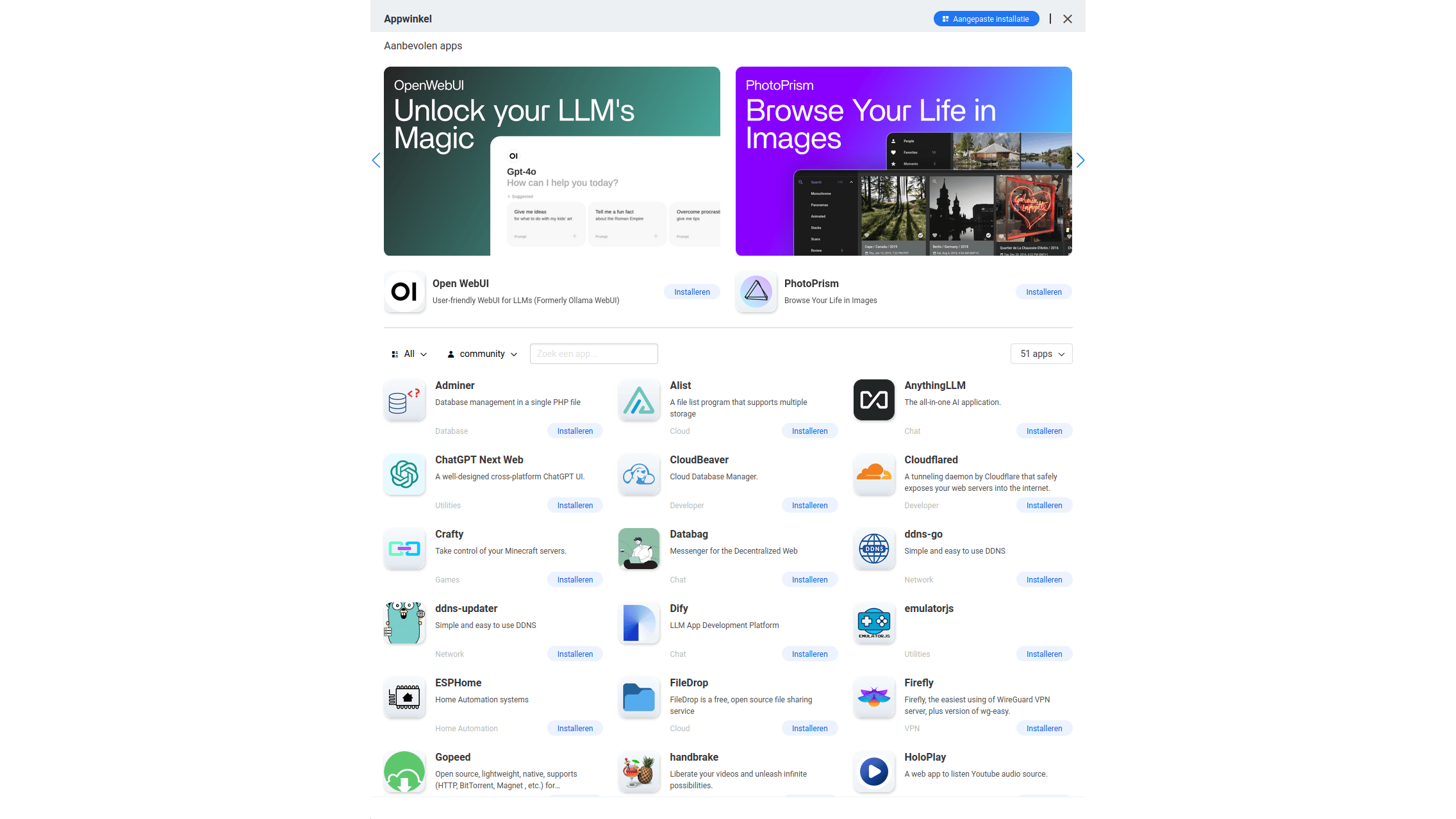 - Importeer extra applicaties via third-party-appstores of Docker Compose-bestanden