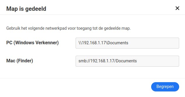 Verder maakt CasaOS het delen van mappen op het netwerk heel eenvoudig. Klik op de drie puntjes rechts bovenaan de gewenste map en kies dan Delen in het contextmenu dat verschijnt. De map wordt onmiddellijk gedeeld en je krijgt te zien via welk netwerkpad de map toegankelijk is in Verkenner (Windows) of in Finder (macOS).