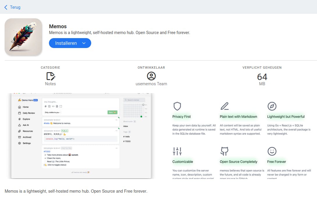 Klik je op een van de apps in de lijst, dan krijg je een korte beschrijving, en een of meerdere screenshots te zien. Vaak staat er ook bij hoeveel MB geheugen de app nodig heeft. Klik op de blauwe knop Installeren om de app met de standaardconfiguratie te installeren. Op de achtergrond downloadt CasaOS dan een Docker-image van de app en installeert deze als een container op je Linux-server.