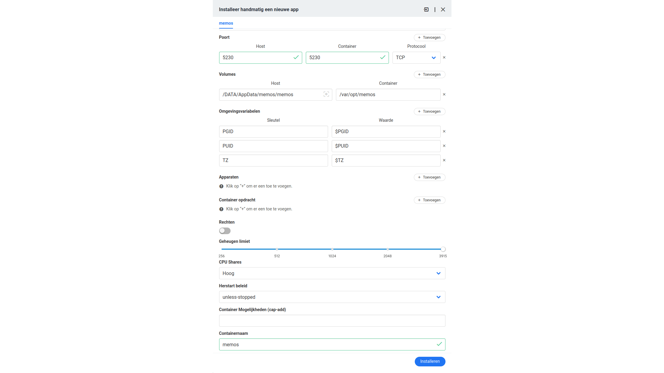Dit gebeurt allemaal transparant op de achtergrond. Wil je meer flexibiliteit, klik dan op het pijltje-omlaag helemaal rechts in de knop Installeren en kies dan de optie Aangepaste installatie. Je krijgt nu alle mogelijke eigenschappen van de container te zien en kunt deze individueel aanpassen. Zo kun je een ander Docker-image of andere tag kiezen, en omgeleide poorten, volumes en omgevingsvariabelen configureren. Je kunt de container ook toegang tot specifieke apparaten geven, een specifieke opdracht laten uitvoeren en een limiet instellen op de hoeveelheid geheugen die de container mag innemen.