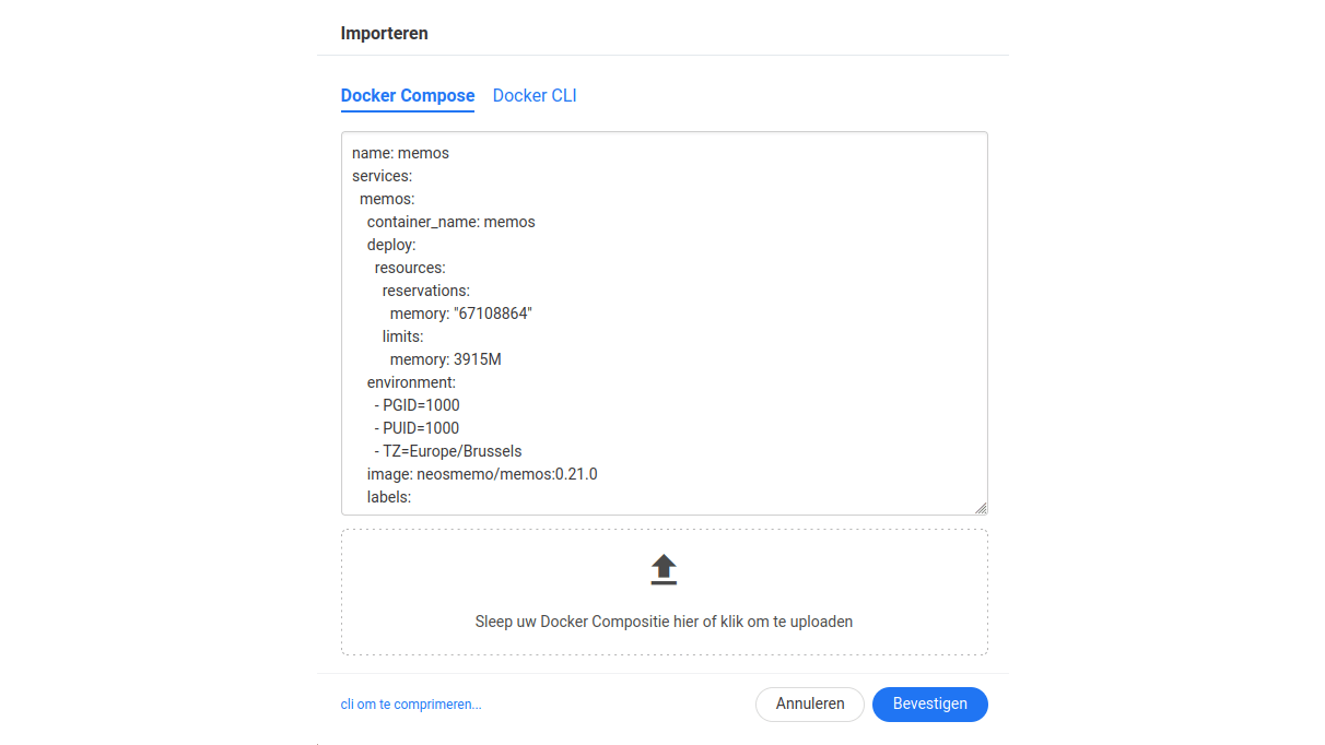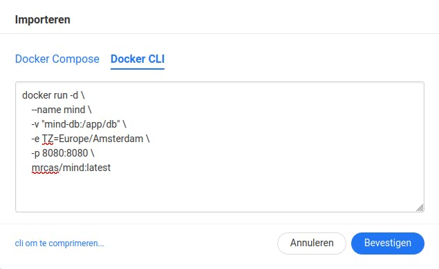 Met het meest rechtse icoontje in het instellingenvenster exporteer je de huidige containerconfiguratie naar een yaml-bestand voor Docker Compose. Hiermee kun je op elke andere Linux-machine met Docker Compose de app opstarten. Eventueel moet je dan wel het pad met de data voor de container aanpassen.