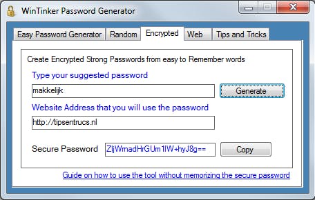 Vindt u het lastig zelf complexe wachtwoorden te bedenken, weet dan dat er - ook online - heel wat wachtwoordgenerators zijn die voor u wachtwoord(lijst)en creëren, zoals FlyingBit Password Generator en WinTinker Password Generator. Met de eerste tool kunt u weliswaar in één keer een hele lijst met wachtwoorden genereren, maar de tweede valt om een andere reden op. Die kan namelijk op uiteenlopende manieren een wachtwoord genereren: 1) u geeft zelf aan hoeveel en welk soort tekens u in het wachtwoord wilt, of 2) u tikt een (wacht)woord in en de tool maakt er een 'speciale' versie van (tips&trucs wordt bijvoorbeeld 7!p$&7ruc$), of 3) u vult een eenvoudig wachtwoord in, samen met de url van de dienst waarvoor u het wilt gebruiken en de tool 'berekent' er een veilige versie van. Vergeet u ooit dat wachtwoord, dan is er geen nood: u kunt het altijd opnieuw laten berekenen, ook online (de nodige links vindt u terug op het tabblad Web van de tool). Dat is veilig zolang u niemand vertelt dat u van deze tool gebruikmaakt.