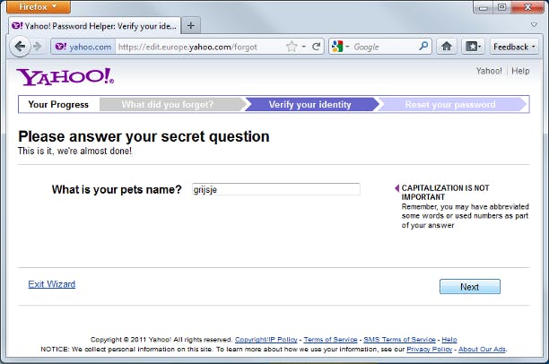 Veel services werken met een geheime vraag of geheugensteun, zoals Yahoo!