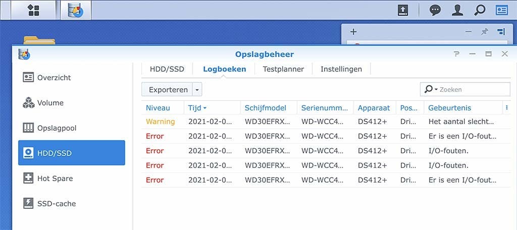 Hoor je een schijf echter regelmatig haperen, herstarten, kloink-geluiden maken enzovoort, dan is de kans levensgroot dat er allang fouten ontdekt zijn door je nas. Die fouten vind je door in te loggen bij de gebruikersinterface; klik dan op de startknop en vervolgens op Opslagbeheer. Klik in het geopende venster op HDD/SSD. Je ziet nu een overzicht van alle fysieke drives. Nu wordt het wat verwarrend: je nas ziet een drive zelfs na het constateren van een fout niet direct als problematisch. Dat gebeurt pas na een aantal serieuze fouten, niet bij de eerste. Kortom: check in de oorspronkelijke waarschuwing welke schijf precies de mist is ingegaan. Klik hierop in het overzicht en dan op de knop Logboeken. Bingo! Hier is duidelijk iets fout gegaan.